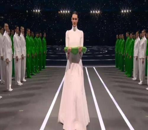 在国歌声中,意大利时装模特维多利亚·切雷蒂(Vittoria Ceretti)代表东道主意大利在米兰举着意大利国旗亮相。