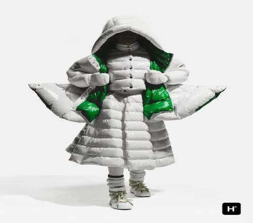 这件斗篷采用了空气感温隔绝技术。巨大的廓形内部其实形成了一个微型的热对流循环空间。运动员可以把腿和手完全缩进斗篷里,就像钻进了一个站立式的睡袋。