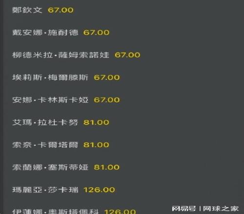 相对于莱巴金娜以3.6排在首位,斯瓦泰克以4排在第二位,高芙以7排在第三位,以及阿尼西莫娃以8排在第四位,郑钦文直接以67排在倒数第三。