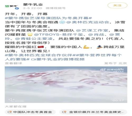 此外在开幕式前,蒙牛正式发布了冬奥会主题片,明星阵容庞大。导演是张艺谋,易烊千玺、肖战、贾玲、谷爱凌等蒙牛代言人悉数出现在镜头里。这是一个标准的品牌大片,冰雪和中国红色窗花相遇,各位代言人用滑雪、滑冰的姿态出现在镜头里,穿插着意大利的城市景观和冬奥赛事镜头。扣题、阵容强大、有视觉美感。