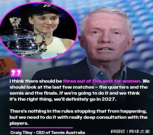 针对以上论调,澳网赛事总监克雷格·泰利表示,澳网有计划在2027年试行从1/4决赛开始,可能会要求女子比赛采用五盘三胜制,不过这项改革还需要与球员进行深入的探讨和协商。