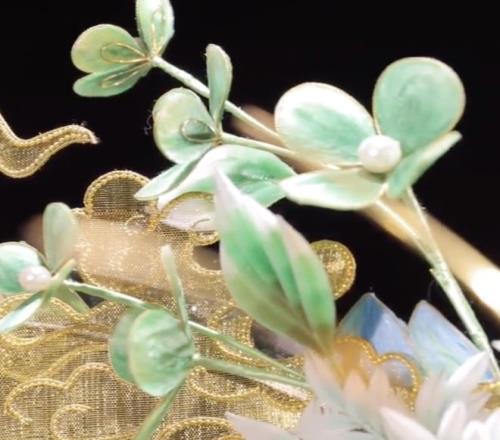 ”绒花“这个词,很形象地描述出了这种技艺的特点:它用 天然蚕丝和铜丝等作为原材料,拟成花朵的造型 , 同时能还原出花叶“带绒”的微妙触感。