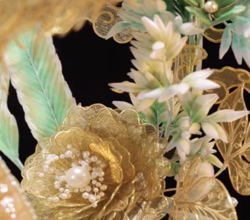 指的是把金、银等贵金属“拉”成细到头发级别的丝,再用各种独门手法,把金属丝做成纹样与立体结构,结合宝石珍珠镶嵌完成作品。