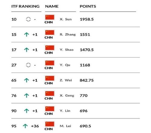 中国女网小花世界排名TOP200榜单:10.孙心然(2010年7月);15.张瑞恩(2008年4月);17.邵羽杉(2008年12月);27.渠依含(2009年3月);65.魏彰倩(2008年1月);76.耿心乐(2010年11月);90.林禹君(2010年6月);95.雷麦洛迪(2009年1月);131.吴汝茜(2008年8月);152.王小童(2009年6月);184.邓沛恩(2008年2月)。
