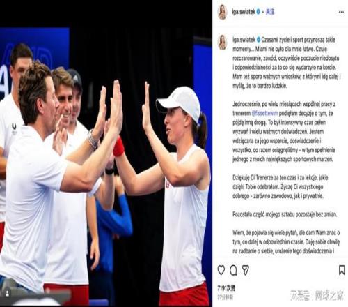 今晚,斯瓦泰克无预警官宣结束与教练费塞特的合作,在声明中写道:“有时候,人生和体育总会带来这样的时刻……迈阿密这站比赛对我而言充满挑战。我当然感到失望、苦涩,也为自己在场上的表现承担责任。与此同时,我也学到了许多重要的一课,我认为这是人之常情。话虽如此,在与我的教练维姆·费塞特共事数月之后,我决定选择一条不同的道路。那段时光紧张而充实,充满挑战,也收获了许多宝贵的经历。我感谢他的支持、他的经验,以及日皮视频软件下载共同取得的一切成就——其中包括我在体育生涯中最大的梦想之一。”