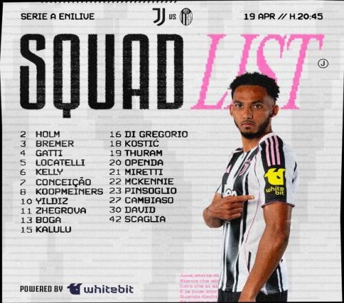 北京时间4月19日,尤文官方公布联赛第33轮,主场对阵博洛尼亚的大名单。伊尔迪兹领衔,麦肯尼解禁回归,弗拉霍维奇、佩林、米利克、阿季奇、卡瓦尔伤缺。