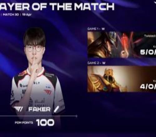 体育资讯4月19日称 在今日的LCK常规赛上,T1以2-0的比分横扫KRX,本场BO3中Faker状态神勇两局一次不死打出9-0-14的战绩!