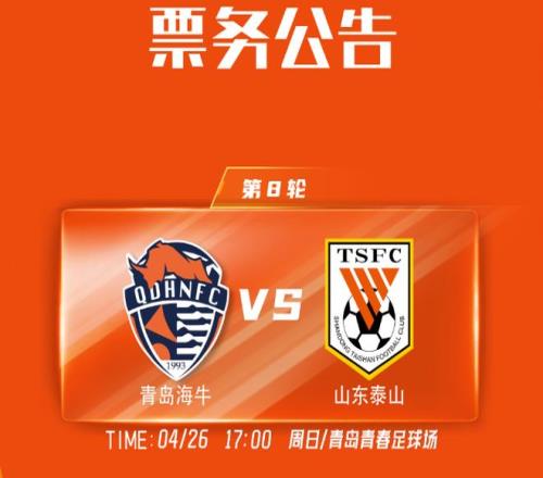 4月26日(星期天)17:00,在2026赛季中超联赛第8轮的一场焦点对决中,青岛海牛坐镇主场青岛青春足球场,与山东泰山上演齐鲁德比。4月20日,青岛海牛足球俱乐部发布了这场比赛的票务公告。