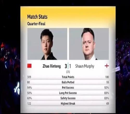 比赛开始后,赵心童展现火热手感,在第一局接手后打出单杆122分的清台,以122-16先下一城。