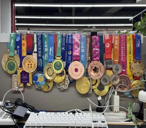 「杨帆的工位上,摆放着他的部分马拉松奖牌」