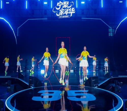「王晓亮(中)和跳绳俱乐部在司庆舞台上表演花式跳绳」