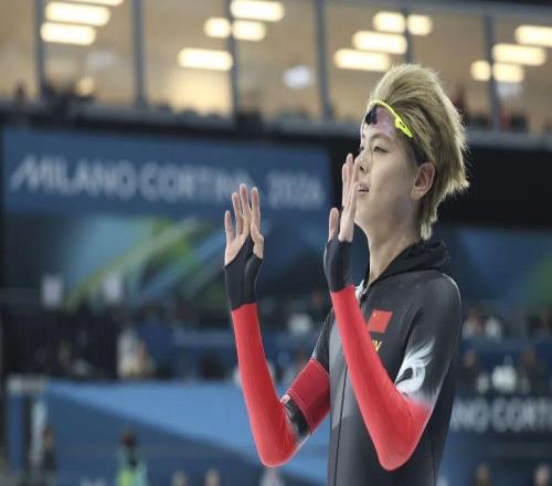 领先日本队选手冲过终点后,兴奋的刘瀚彬连连挥拳庆祝。当地时间2月8日下午结束的米兰冬奥会速度滑冰男子5000...